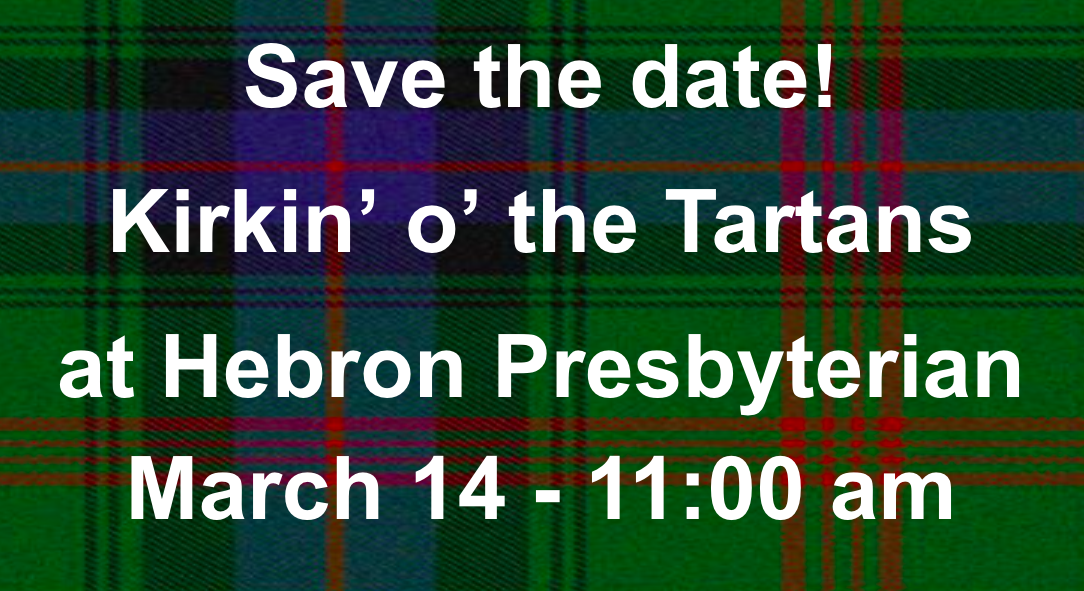 Apr 14 11:00 AM11:00 Kirkin' o' the Tartans Tuesday, April 14, 2026 11:00 AM 12:00 PM 11:00 12:00 1255 Hebron Road Commerce, GA, 30530 (map) Google Calendar ICS Kirkin' o' the Tartans--a celebration of blessing upon the Scottish clan leaders and leaders of our community! Wear your kilt and your Scottish plaid and celebrate with bagpipe and blessings! View Event →